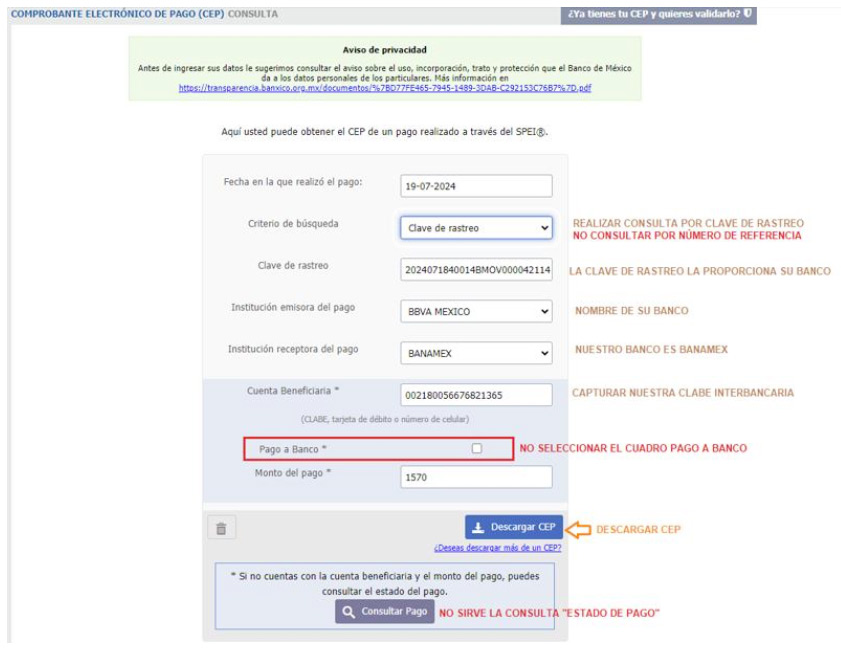 Si su banco no es Banamex, debe enviarnos el archivo .PDF del Comprobante Electrónico de Pago (CEP) de Banco de México (Banxico).