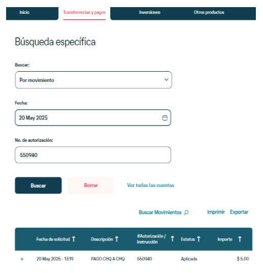 Ya dentro del apartado de «Ver movimientos de BancaNet» hay que realizar la búsqueda por «Por movimiento» e ingresando la fecha del pago junto con el «No. de autorización» dan click en buscar y les arroja el resumen del pago: